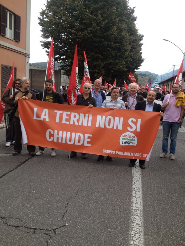 Presente anche Sinistra Ecologia Libertà con un suo striscione. «Se si vuole risolvere la crisi fermando i licenziamenti alle Acciaierie Speciali Terni, Renzi convochi la multinazionale tedesca a Palazzo Chigi. La Presidente dell’Umbria e il Sindaco portino a Terni la data della convocazione. Anche questo si aspetta la manifestazione di oggi a Terni. Renzi rimedi agli errori fatti. La terza “T” aspetta» ha dichiarato Giorgio Airaudo responsabile lavoro e deputato di Sel.
