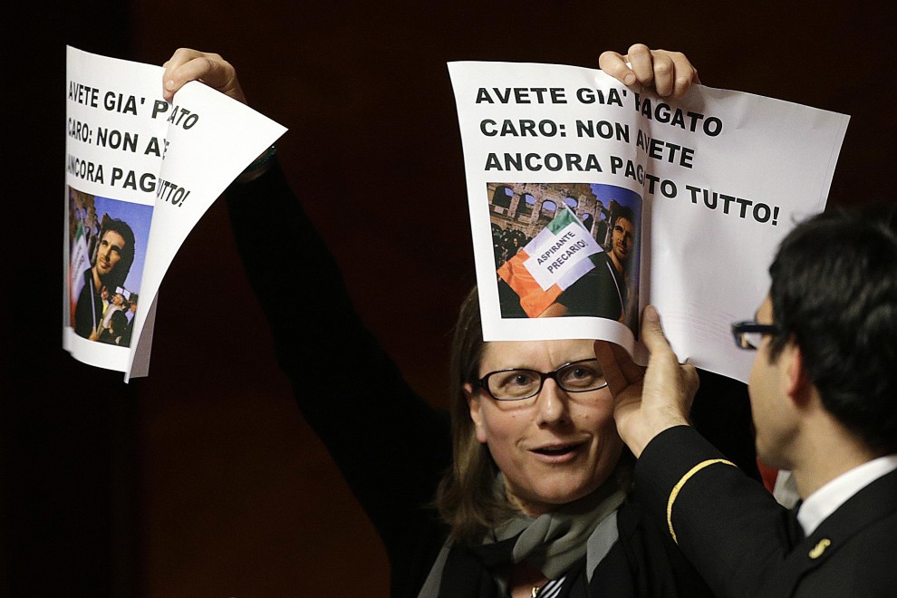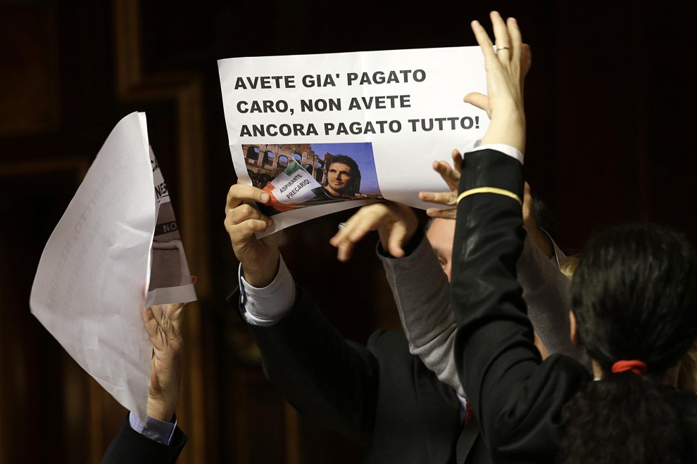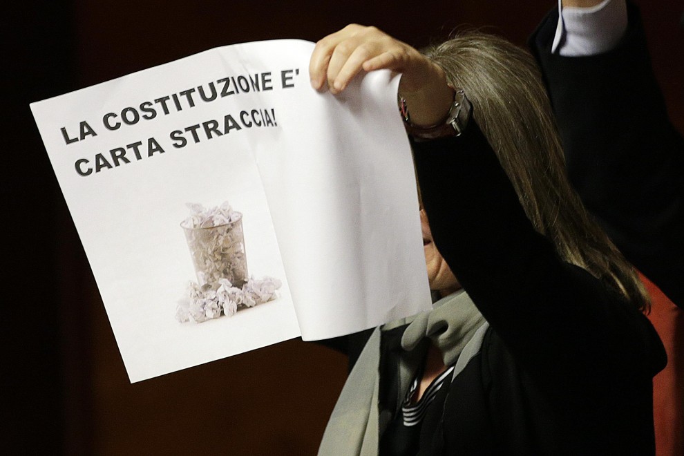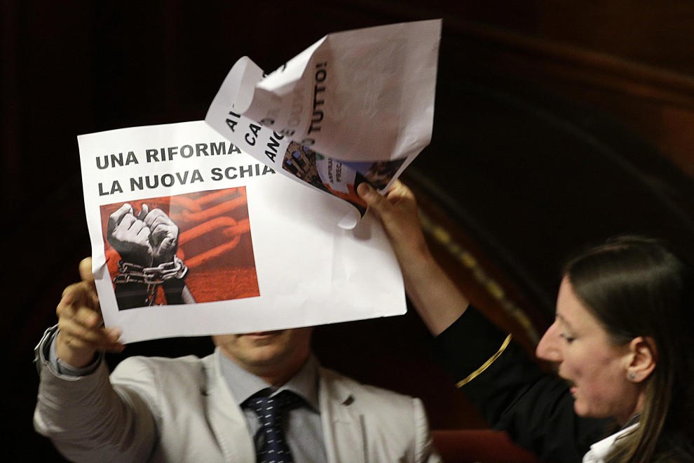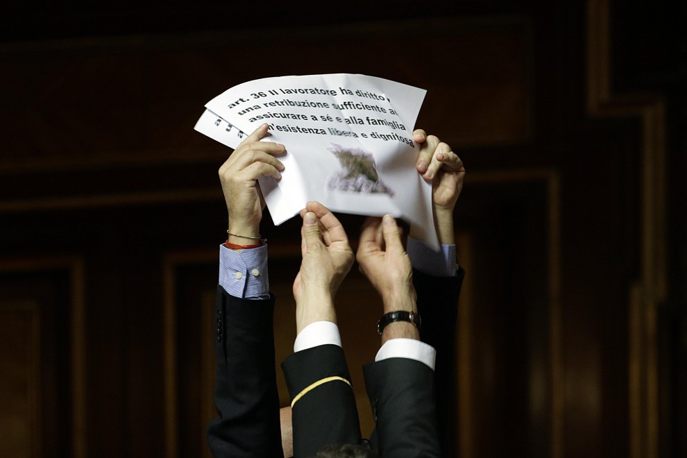 Alcuni senatori hanno innalzato cartelli con le foto di cestini accanto ad articoli della Costituzione dedicati al lavoro e che per Sel con questo provvedimento rischiano di finire nel cestino come carta straccia. «L’Italia – si legge – ERA una Repubblica democratica fondata sul lavoro». E ancora: «La »Costituzione è carta straccia», «Una riforma moderna: la nuova schiavitù», recitava un altro cartello con foto di mani legate con catene.