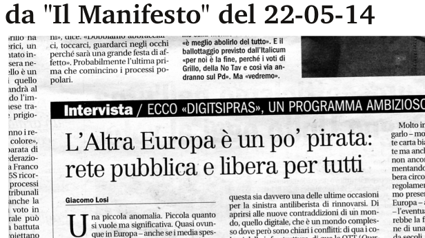 Qualcosa si è mosso. Tredici candidati hanno aderito a DigiTsipras (Finiguerra, Lipperini, Padoan, Seibezzi, Cirelli, Lugli, Casarini, Fattori, Medici, Zanardo, Furfaro, Bolini e Agostini) e hanno preso l’impegno a collaborare con i pirati eletti negli altri paesi per condurre assieme le battaglie contro i signori del copyright e contro il Ttip. Tutti hanno assicurato che questa battaglia non finisce col voto di domenica.