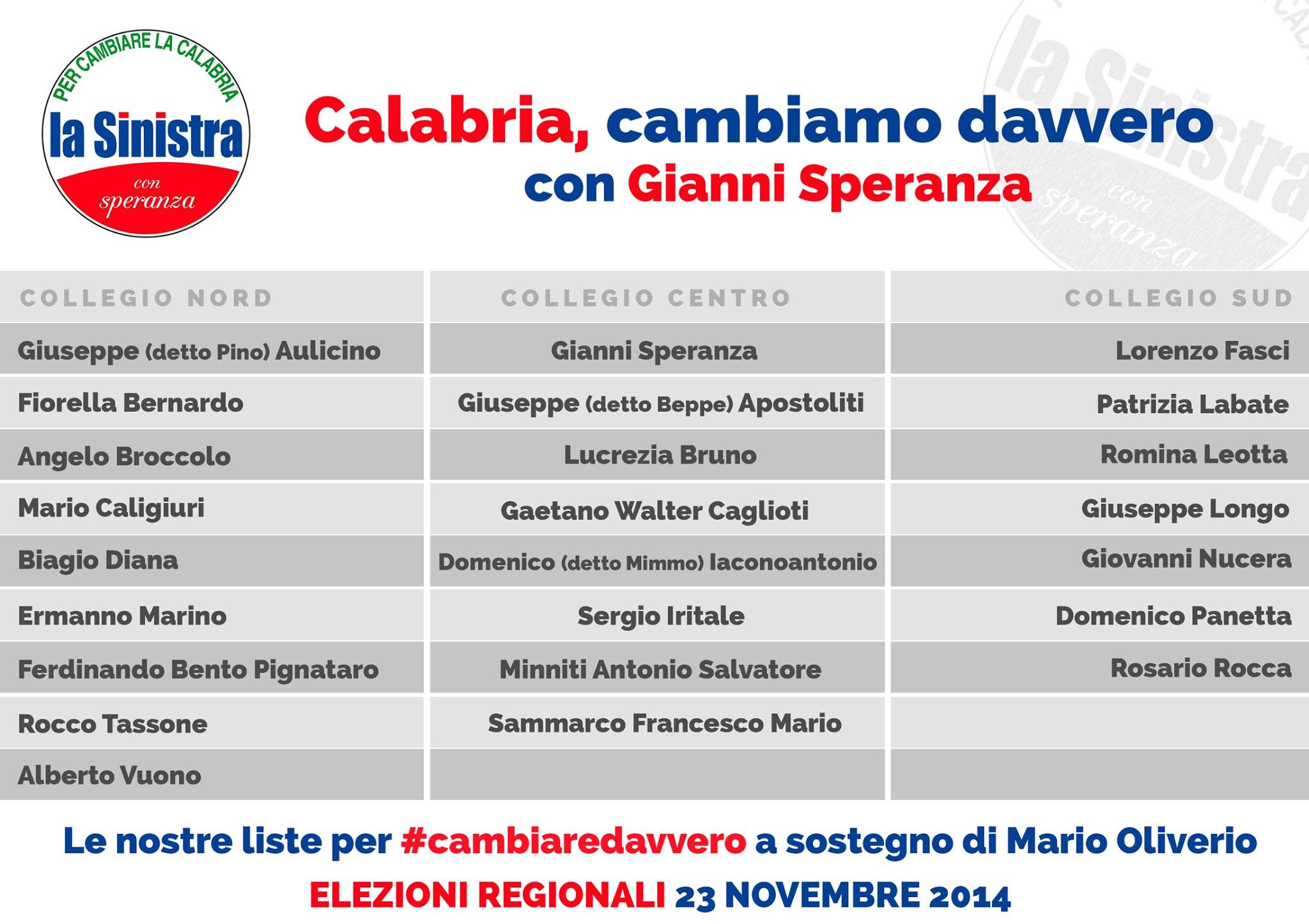 Una lista unitaria e aperta, che attorno all’esperienza politica ed amministrativa di Gianni Speranza ha deciso di portare avanti una battaglia di rinnovamento e di riscatto per la propria terra. Più forte sarà la Sinistra, questa lista, il prossimo 23 novembre, più serio e coerente sarà il percorso di cambiamento che dovrà essere portato avanti in Calabria.