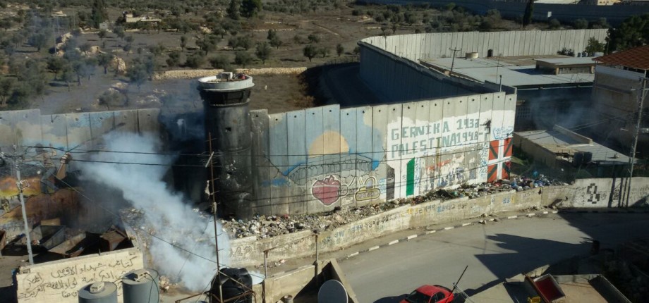 Siamo arrivati mentre era in atto un’incursione da parte delle forze di polizia israeliane che sono entrate da un portone del muro nell’area palestinese, aprendo con un fitto lancio di lacrimogeni. In poco più di mezz’ora sono stati sparati oltre 50 lacrimogeni, rendendo l’aria irrespirabile. Volevano prendere un bambino di 8/9 anni che si era permesso di lanciare sassi contro il muro. Contro il muro!