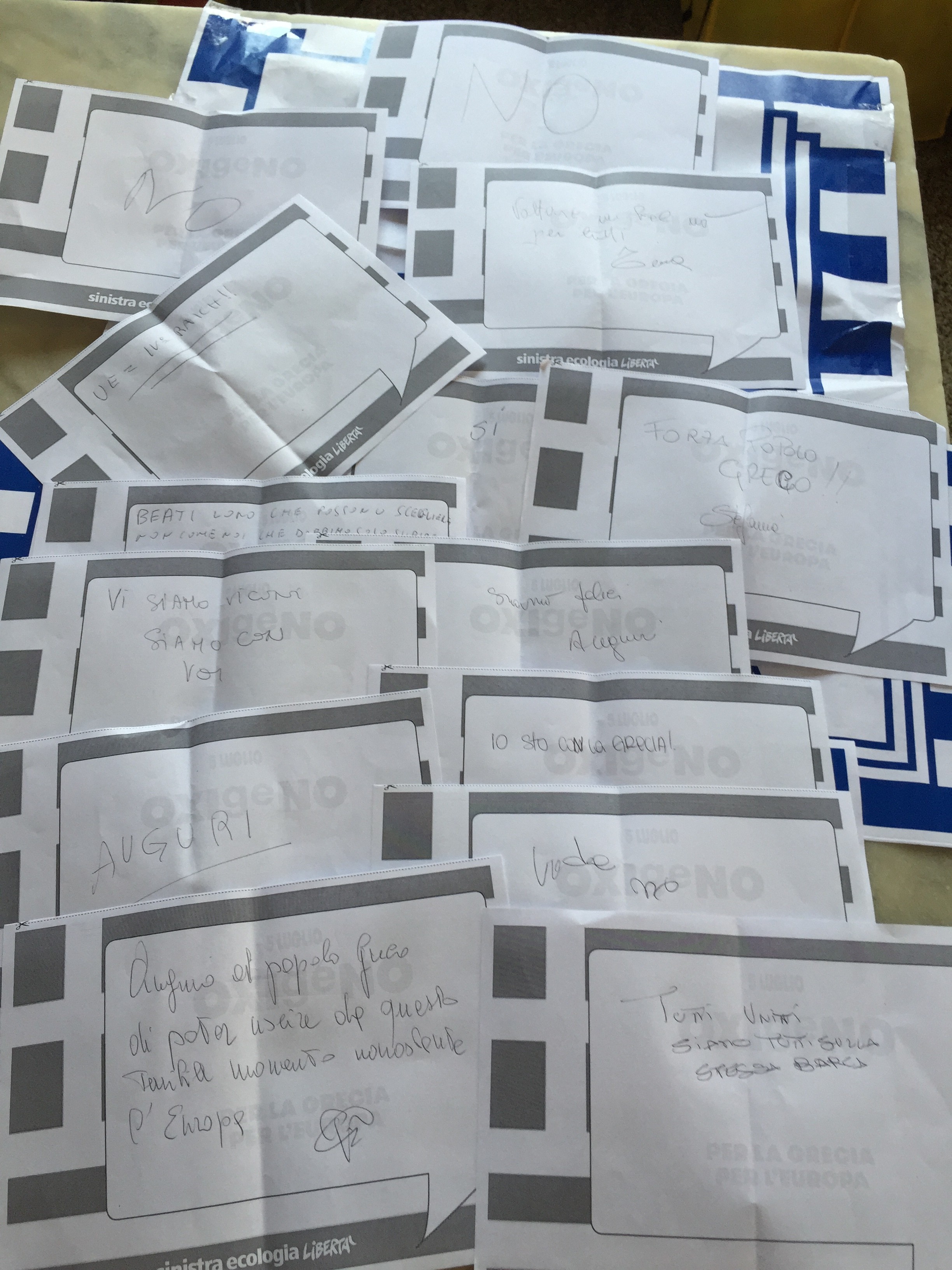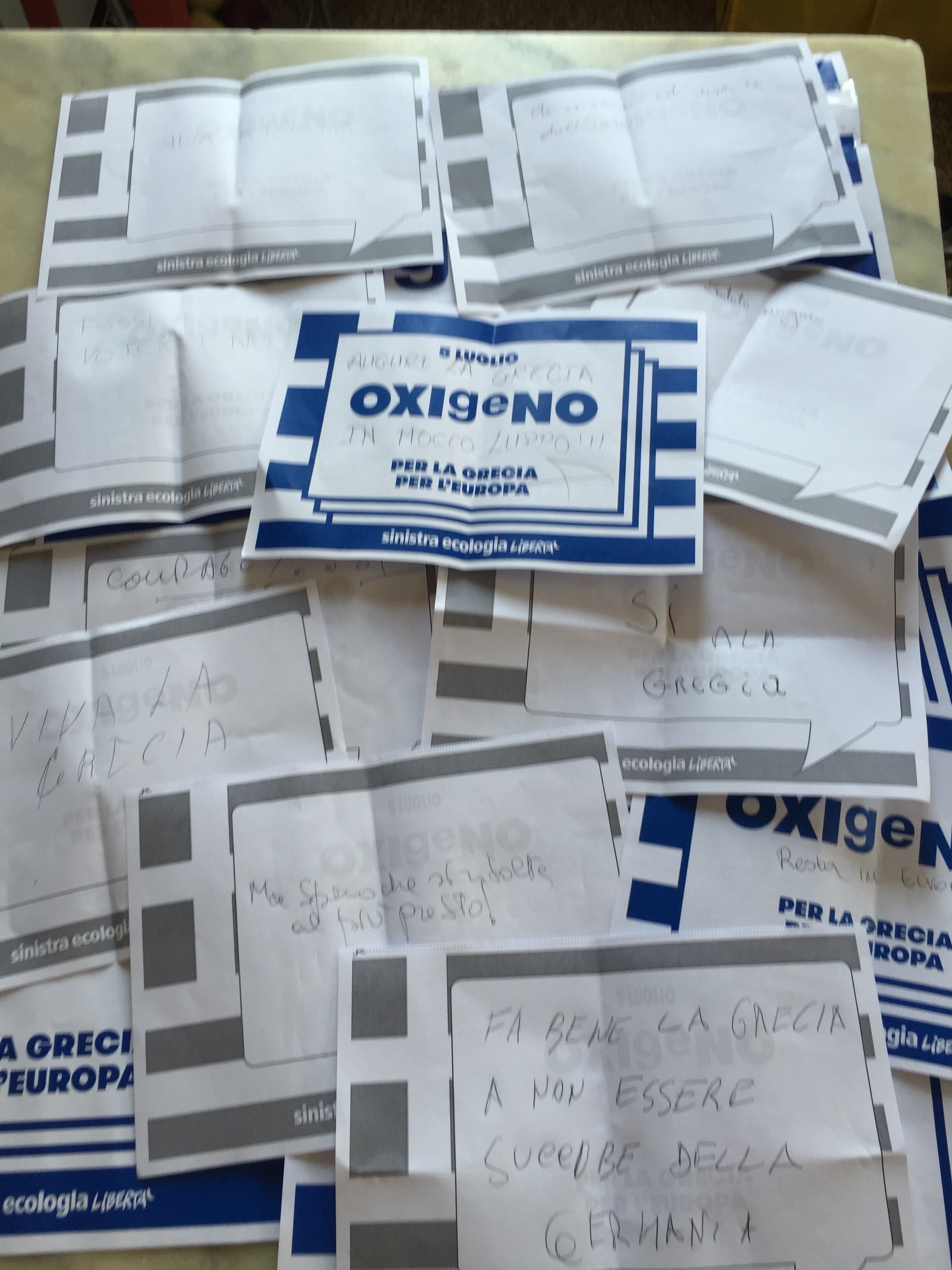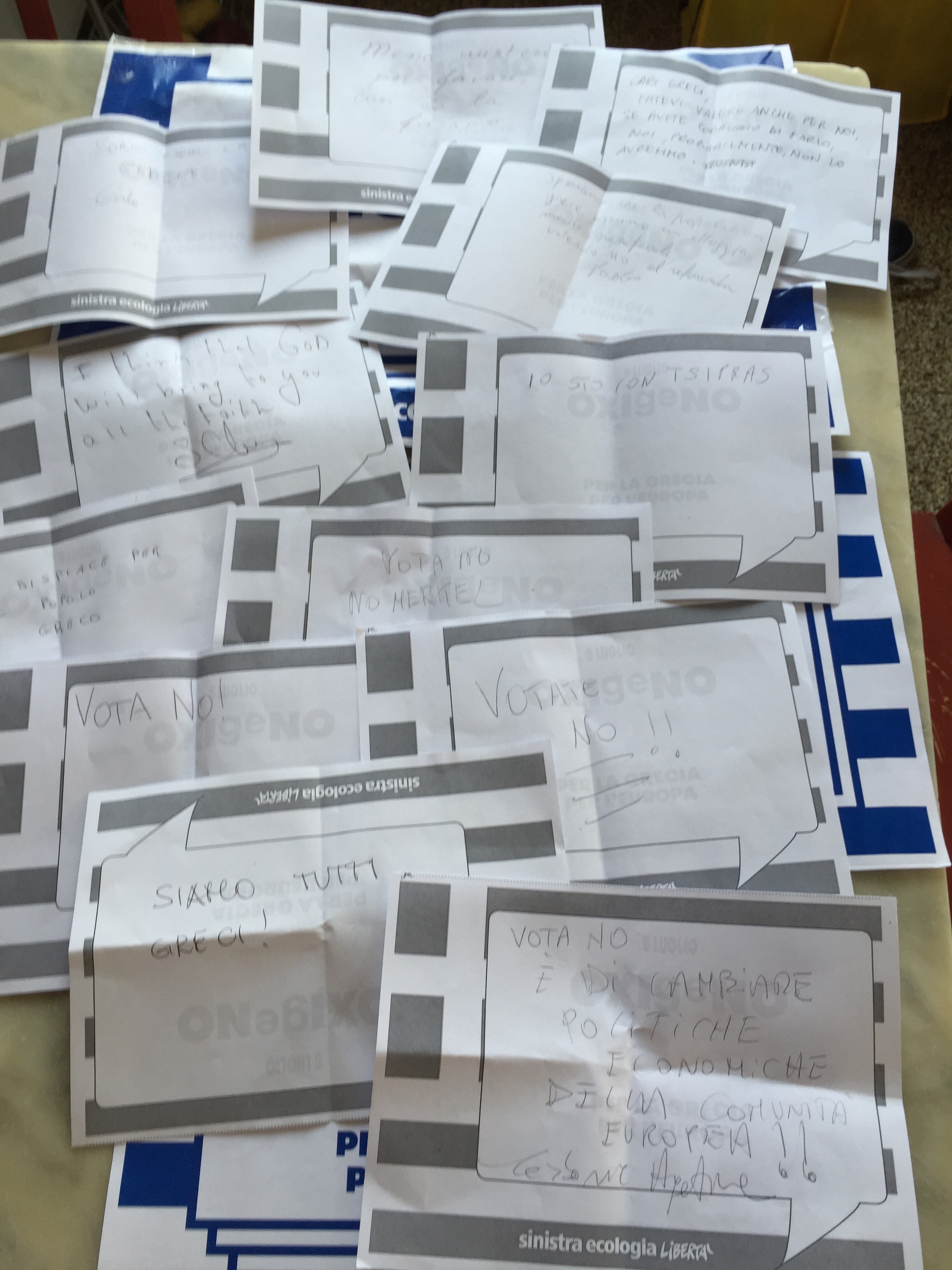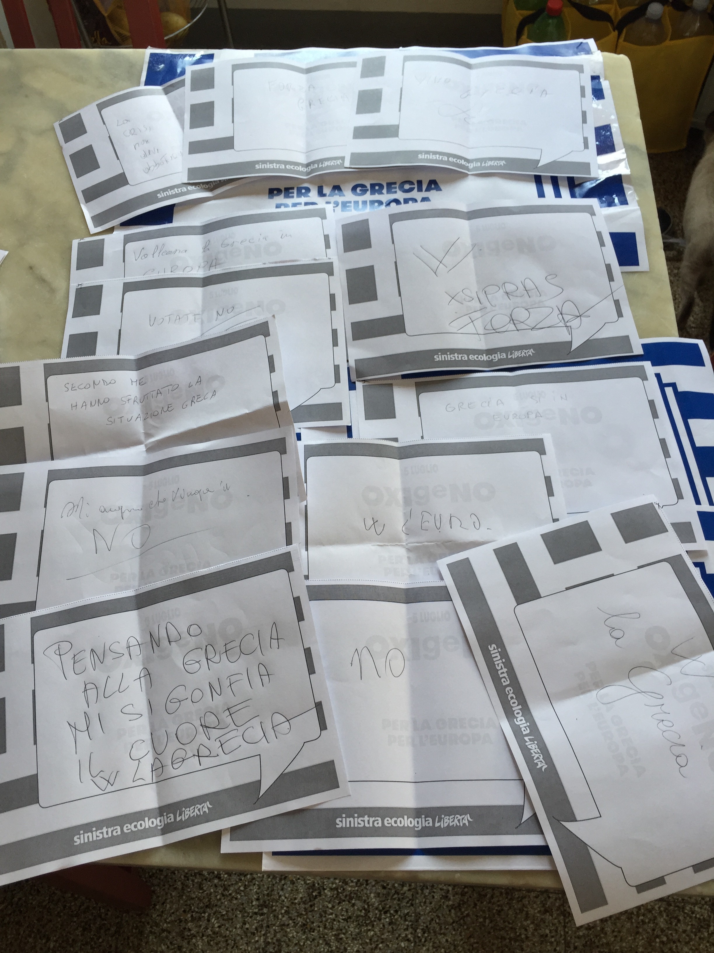 Abbiamo raccolto 50 commenti, un solo sì (ma molte persone pensano che scrivere sì fosse a sostegno della Grecia) e tutti gli altri di solidarietà. Tuttavia la disinformazione è grande anche se umanamente le persone sono sensibili, molte, molte dicono che non sanno che pensare…