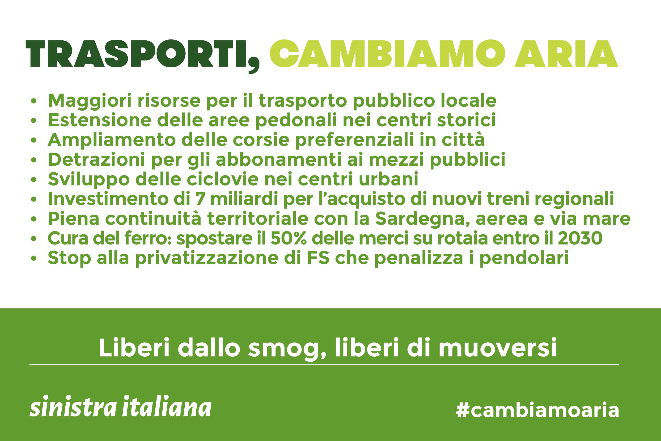 Questa mattina dalla stazione della Roma–Lido di Piazzale Ostiense i parlamentari di Sinistra Italiana hanno lanciato la campagna nazionale ‘Trasporti, cambiamo aria’ accompagnata dallo slogan ‘liberi dallo smog, liberi di muoversi’. L’iniziativa, in occasione del lancio della campagna nazionale ‘Trasporti, cambiamo aria – liberi dallo smog, liberi di muoversi’, è la prima di una serie di manifestazioni ed incontri che si svolgeranno in tutte le stazioni d’Italia nelle prossime settimane.
