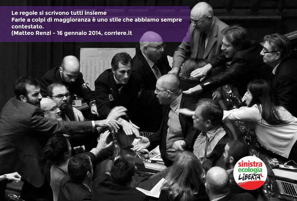 Per Nicola Fratoianni, deputato e coordinatore nazione di Sel, «Non ci sono le condizioni per proseguire il lavoro sulla riforma. Abbiamo provato a discutere e a confrontarci sul merito della riforma della Costituzione e abbiamo ricevuto in cambio indisponibilità e arroganza. Abbandoniamo l’Aula contro questa arroganza esibita da maggioranza e governo, che con l’imposizione della seduta fiume, hanno reso impraticabile qualunque confronto».