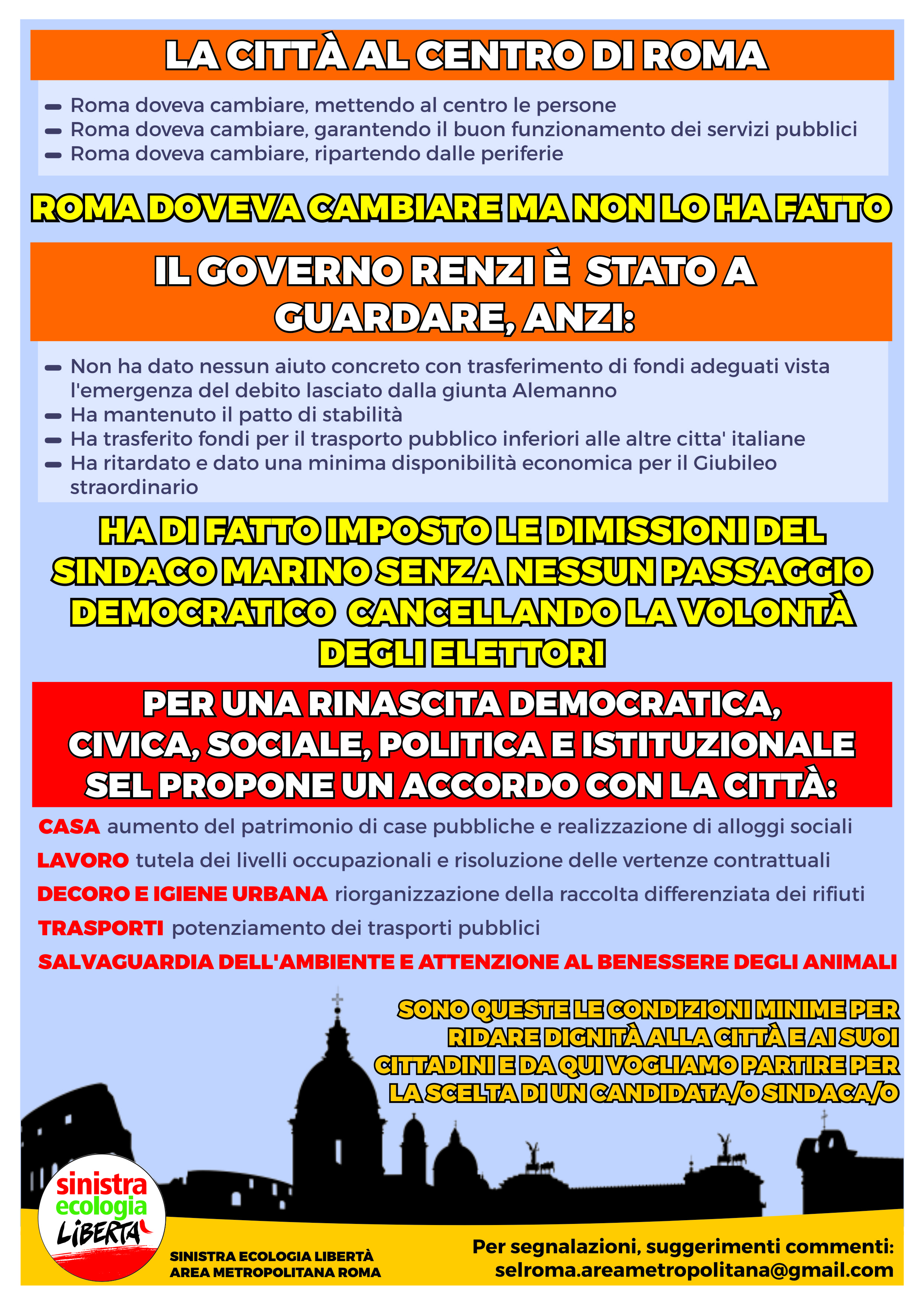Durante il week end verranno distribuiti dei volantini che contengono la proposta di Sel per Roma che parte da alcune priorità e cioè la casa, il lavoro, il decoro e l’igiene urbana, i trasporti e l’ambiente.