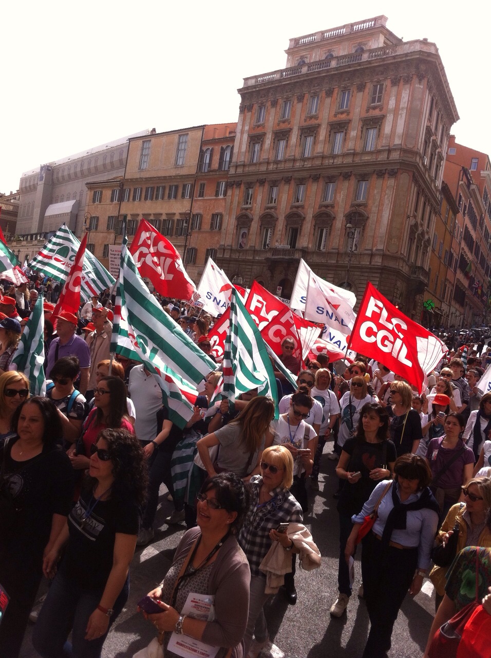 Sarebbero oltre 100mila, secondo fonti della Cgil, i manifestanti che questa mattina hanno preso parte al corteo di protesta a Roma in cui il popolo della scuola ha ribadito il proprio no al disegno di legge di riforma in discussione in Parlamento. Al ritmo di tamburelli, il lungo serpentone che dal Pincio sta raggiungendo piazza del Popolo, non sembra diminuire.